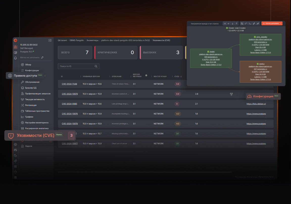 В обновлении реализована поддержка автоматического обнаружения уязвимостей в наблюдаемых СУБД. Платформа Tantor самостоятельно выявляет потенциальные проблемы безопасности и оценивает их критичность по стандарту Common Vulnerability Scoring System (CVSS). Для каждой обнаруженной уязвимости администратор получает рекомендации по ее устранению, что позволяет существенно снизить эксплуатационные риски. В версии 6.2 база уязвимостей обновляется вместе с самой платформой, обеспечивая актуальность данных без дополнительных действий со стороны пользователей.